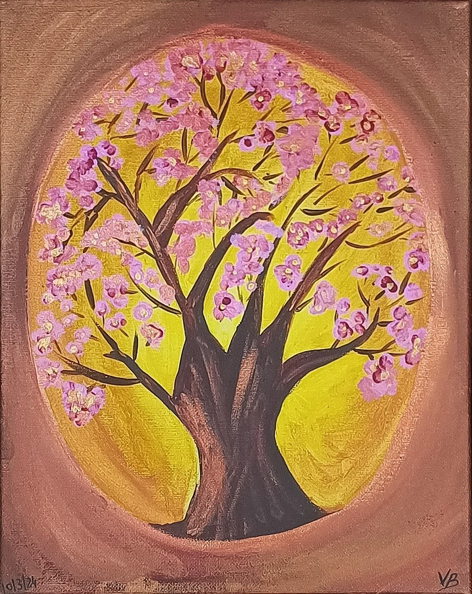 Au milieu de mon jardin trône un magnolia vieux de presque cent ans. Deux fois par an je suis toujours sous le charme de sa floraison. Mon arbre m'a inspiré ce tableau :)