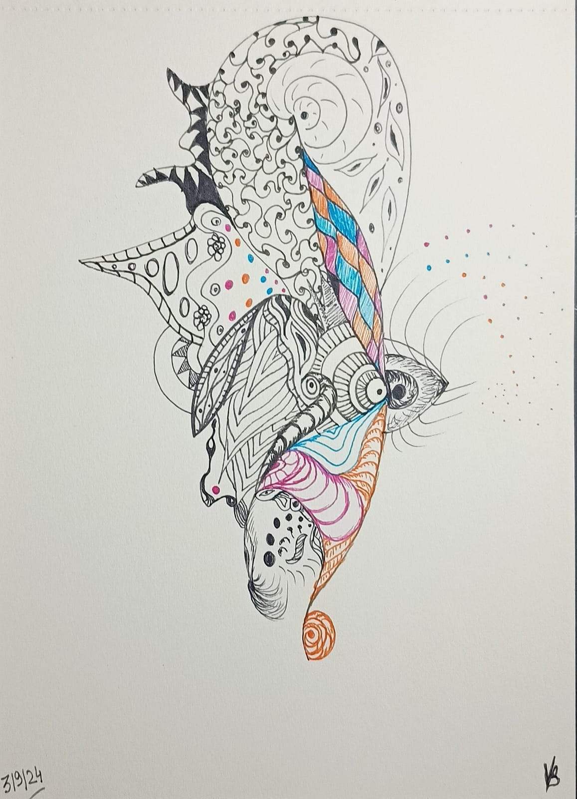 Besoin d'évasion, de se changer les idées ? Rien de plus simple je prend une feuille blanche, mes feutres noirs et qques feutres de couleurs et je laisse les feutres glisser sur le papier sans savoir où cela va aboutir.